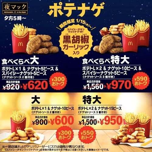2025年1月15日(水)より、マクドナルドが「食べくらべポテナゲ大・特大」を新発売します。 いつもの「ポテナゲ」と「スパイシーチキンマックナゲット 黒胡椒ガーリック」の食べくらべを楽しめるセットが、17時からの「夜マック」に登場です。 「スパイシー…
