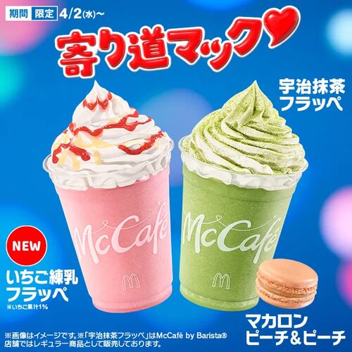 2025年4月2日(水)より、マクドナルドがマックカフェから「寄り道マック」新商品3種類を発売します。 新作「いちご練乳フラッペ」と大人気の「宇治抹茶フラッペ」、「マカロン ピーチ&ピーチ」が期間限定で登場です。 ・「いちご練乳フラッペ(490円~)」…
