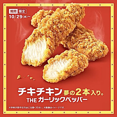 2025年10月29日(水)より、マクドナルドが「チキチキン THE ガーリックペッパー(290円)」を新発売します。 「チキチキン THE ガーリックペッパー」2ピース入りが期間限定で登場です。 サクサクの衣と、粗びきブラックペッパーとガーリックの旨みたっぷり…