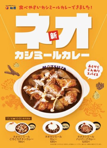 2025年11月4日(火)より、松屋が「ネオカシミールカレー」を店舗限定で新発売しました。 黒みがかったサラサラとしたソースと後を引く辛さが特徴、刺激的な辛さと深いコクがクセになる「カシミールカレー」を、後からじんわりスパイス広がる食べやすい一皿…