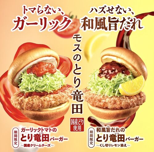 2026年1月28日(水)より、モスバーガーが「とり竜田バーガー」2種類を期間限定で新発売します。 「ガーリックトマトのとり竜田バーガー ~国産クリームチーズ~(490円)」は、国産鶏のむね肉を使用したサクサクのとり竜田に、ガツンと効かせたにんにくが食…