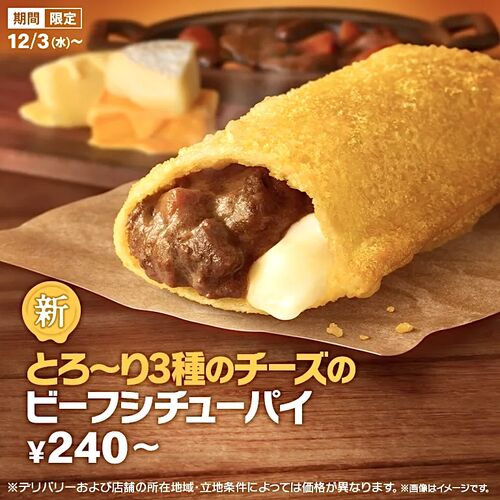 2025年12月3日(水)より、マクドナルドが期間限定メニュー「とろ~り3種のチーズのビーフシチューパイ(240円)」を新発売します。 牛肉と野菜の旨みを引き出したコク深いビーフシチューと、とろ~りまろやかな3種のチーズをサクサクのパイで包んだ一品です…